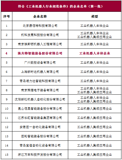 On June 15, 2018, the Ministry of Industry and Information Technology announced the list of the first 15 enterprises in the country that met the "Standard Conditions for Industrial Robotics Industry".