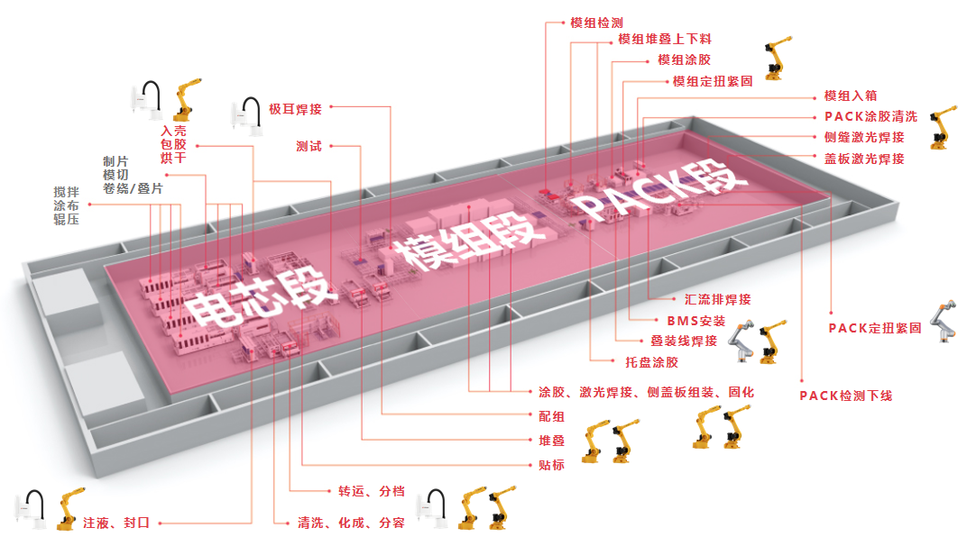 Ebpay拥有桌面系列、小负载、中大负载、大负载系列等丰富的机器人产品阵容,针对锂电池生产中不同的工艺流程和复杂的加工环境均可给予成熟的产品和优异的应用方案。
